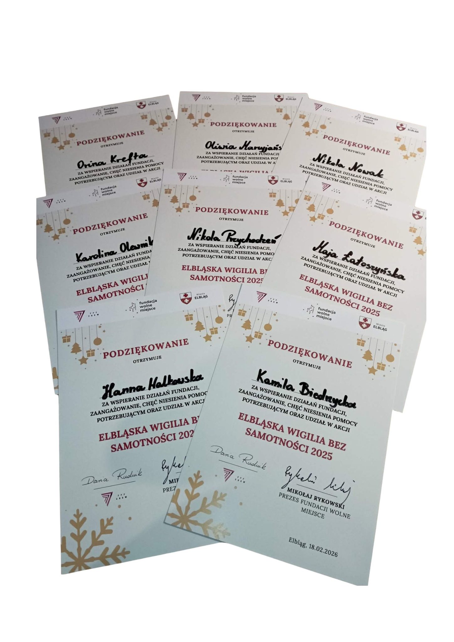 23 grudnia członkowie Szkolnego Koła Wolontariatu wzięli udział w przygotowaniach do wieczerzy wigilijnej w ramach akcji „Wigilia Bez Samotności”, organizowanej przez Wolne Miejsce Elbląg x 777 CREW.