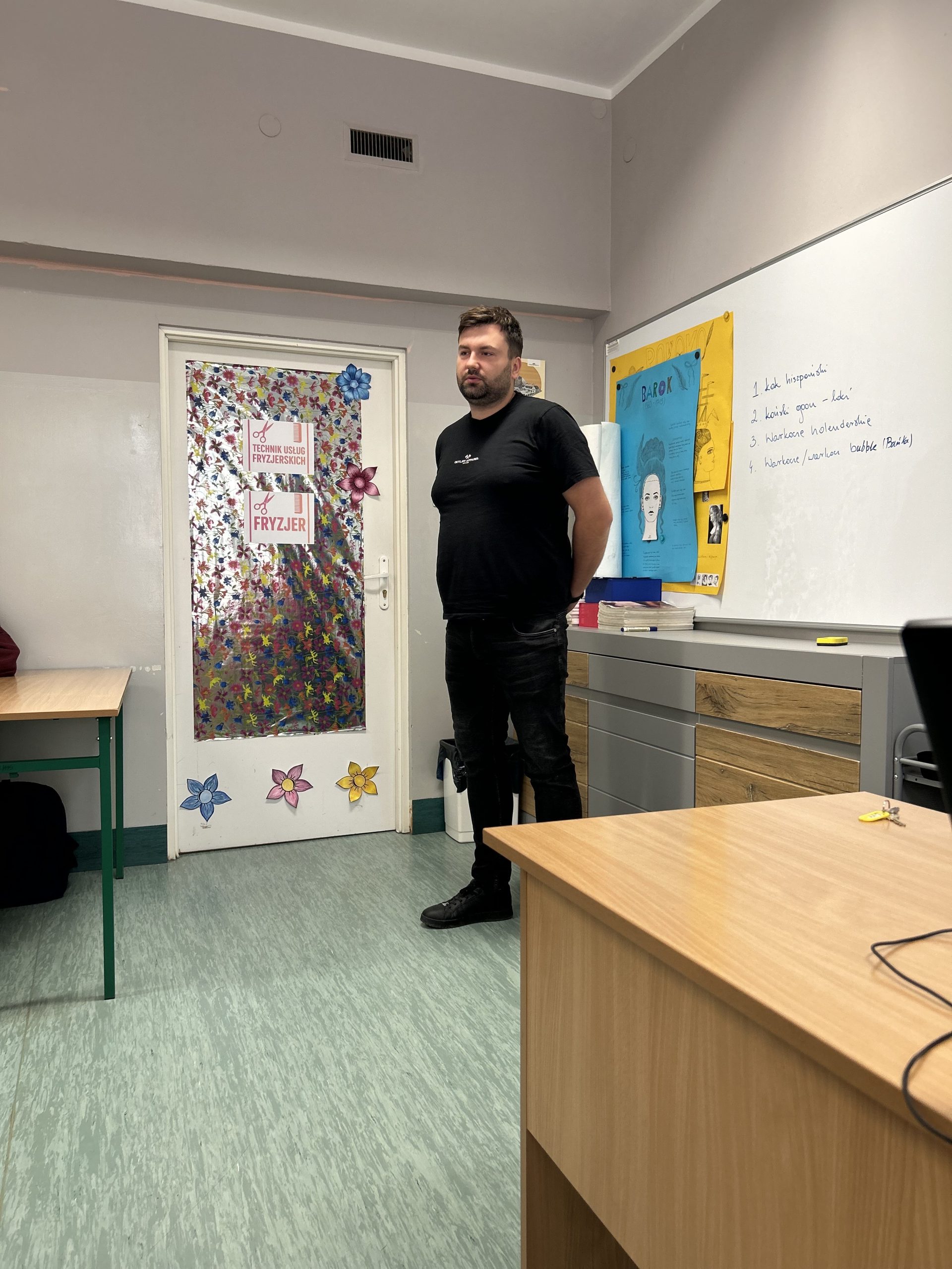 Podzielił się z uczniami swoimi doświadczeniami zawodowymi i refleksjami o pracy w branży beauty.