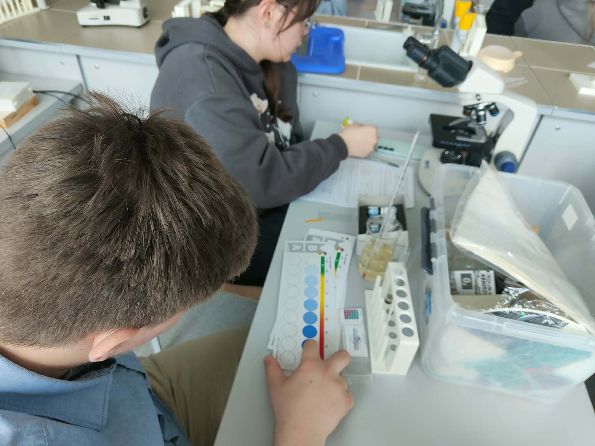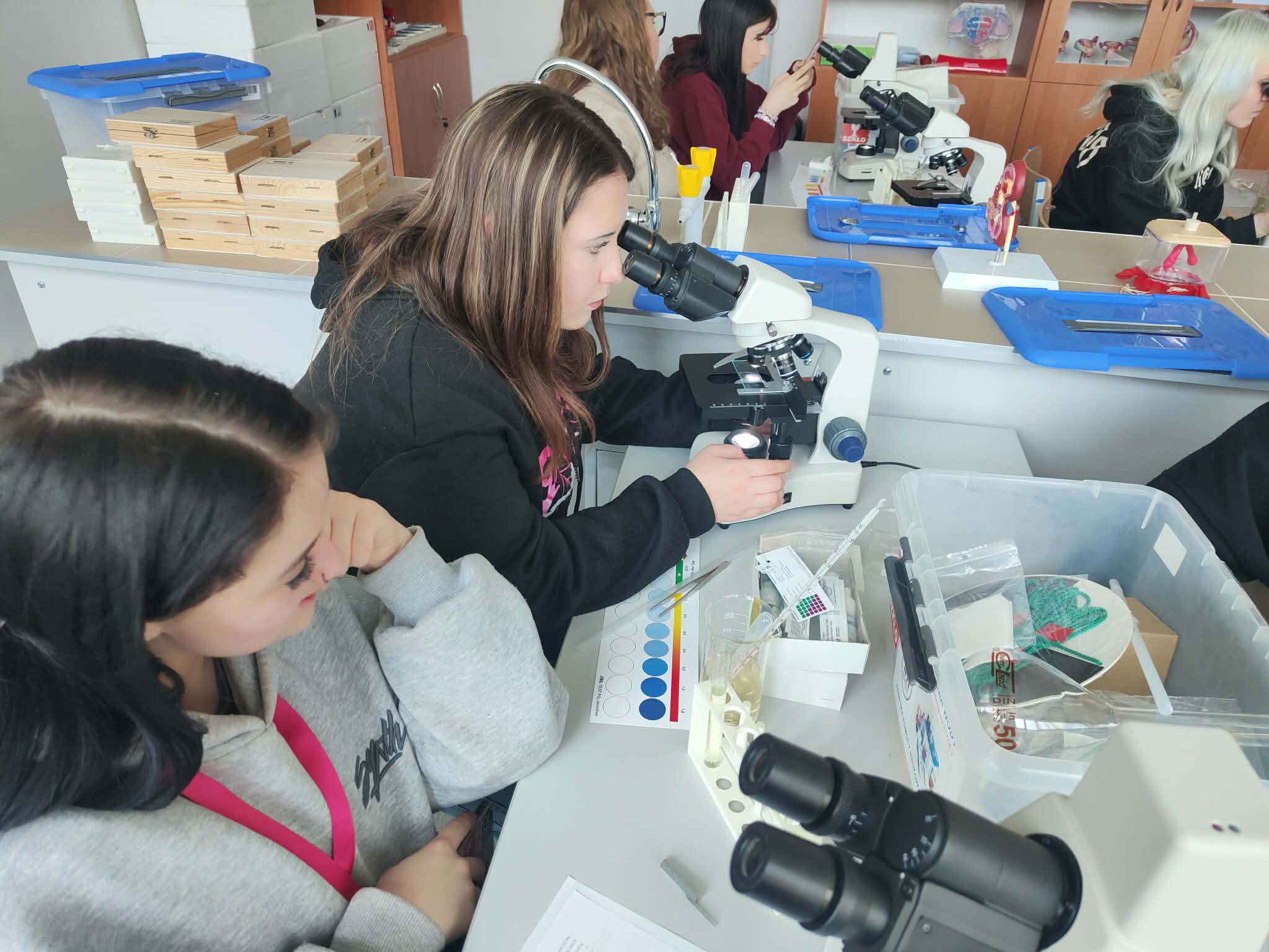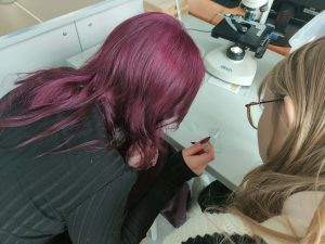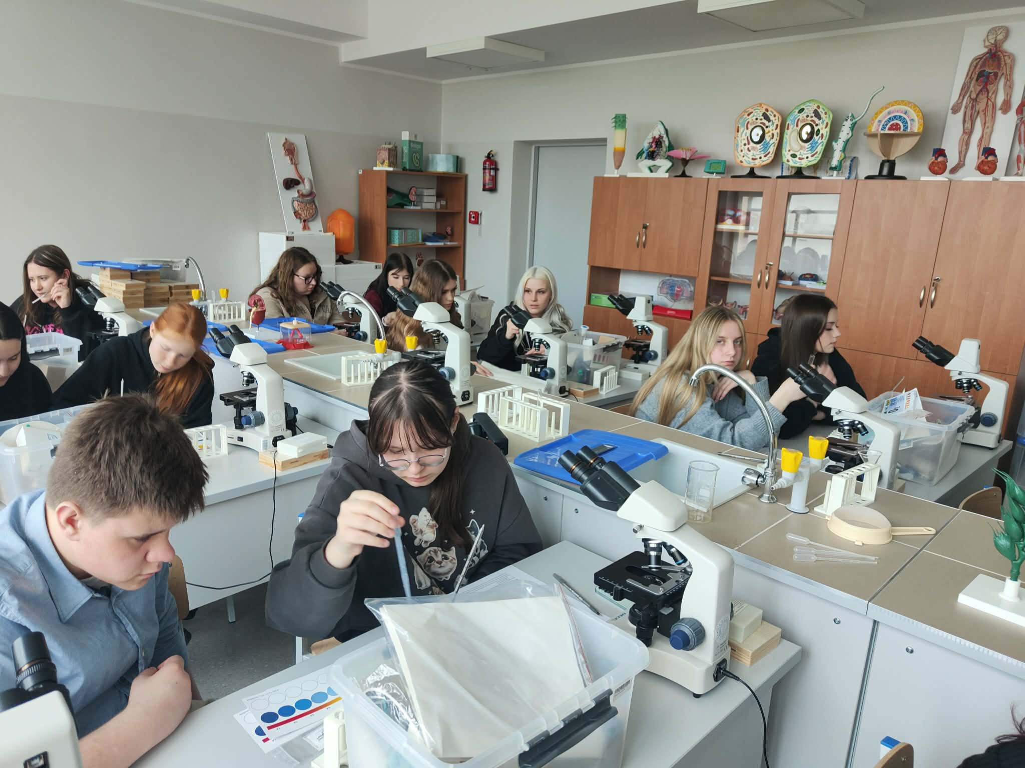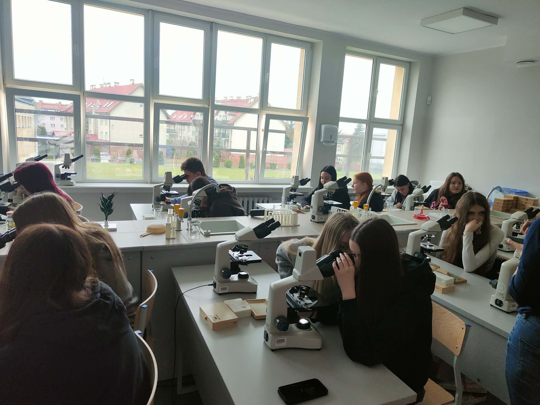 Klasa I technikum usług fryzjerskich uczestniczyła w zajęciach biologii i geografii w Elbląskie Centrum Edukacji Zawodowej ECEZ-CKZiU. W specjalistycznej pracowni uczniowie przeprowadzali analizę próbek wody z rzeki Elbląg (temperatura, PH, zawartość tlenu, ilość azotanów) oraz oceniali jej jakość. Klasa zapoznała się również z zasadami mikroskopowania oraz przeprowadziła obserwacje tkanek roślinnych, zwierzęcych, ale również stworzonych przez siebie na bieżąco preparatów z własnych włosów czy rzęs.